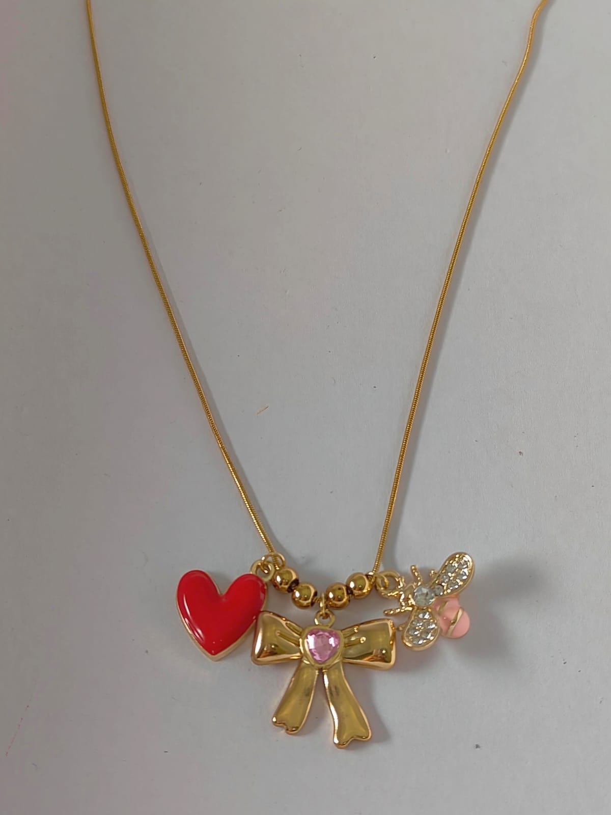Add a playful buzz to your style with this pendant chain featuring charming red heart and pink honeybee charms. Its anti-tarnish finish keeps the colors vibrant, making it a fun and lively accessory that brightens up any outfit with a touch of sweetness and whimsy.
