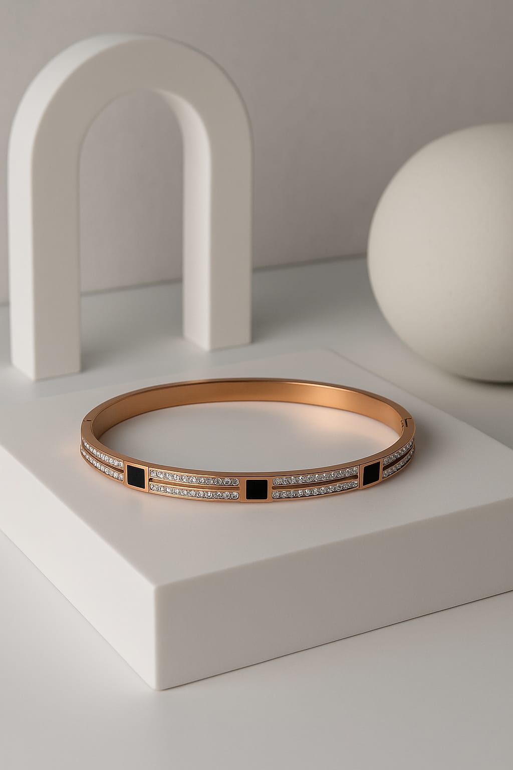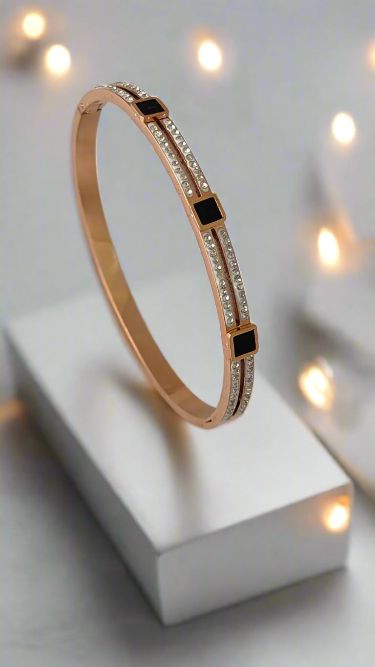 This exquisite rose gold and deep black bracelet features a charming cuff diamond design, elegantly combining sophistication, Crafted with anti-tarnish materials. The striking contrast between the rich rose gold and the deep black stud & diamonds creates a bold statement piece, perfect for any occasion, this bracelet is a statement piece that enhances any jewelry collection.